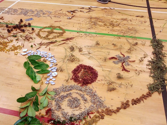 This week I also had an opportunity to attend a workshop by Sharon Wellis on using dry natural materials such as (pinecones, leaves, flower petals, etc...) to create artwork. It was really interesting and I will be incorporating some elements of this into my kindergarten classroom for my Fall Unit. Here's what my cohort created... :) It was really amazing! It makes you appreciate it so much more because after its completion and admiration, we had to clean up the gym it will never be the same again. This is a great lesson for kids to know that things are never forever and they are constantly changing.
